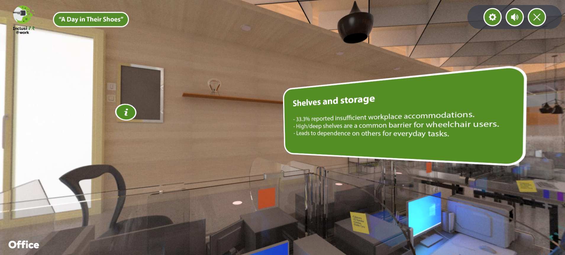 InclusiVR@Work is developing three immersive VR simulations that place users in the shoes of individuals with physical, hearing or visual disabilities in the workplace. These experiences aim to challenge stereotypes, deepen understanding, and encourage inclusive actions through realistic and emotionally engaging scenarios. Designed for smartphones and VR headsets, they will be accessible and impactful for training professionals and employers alike.