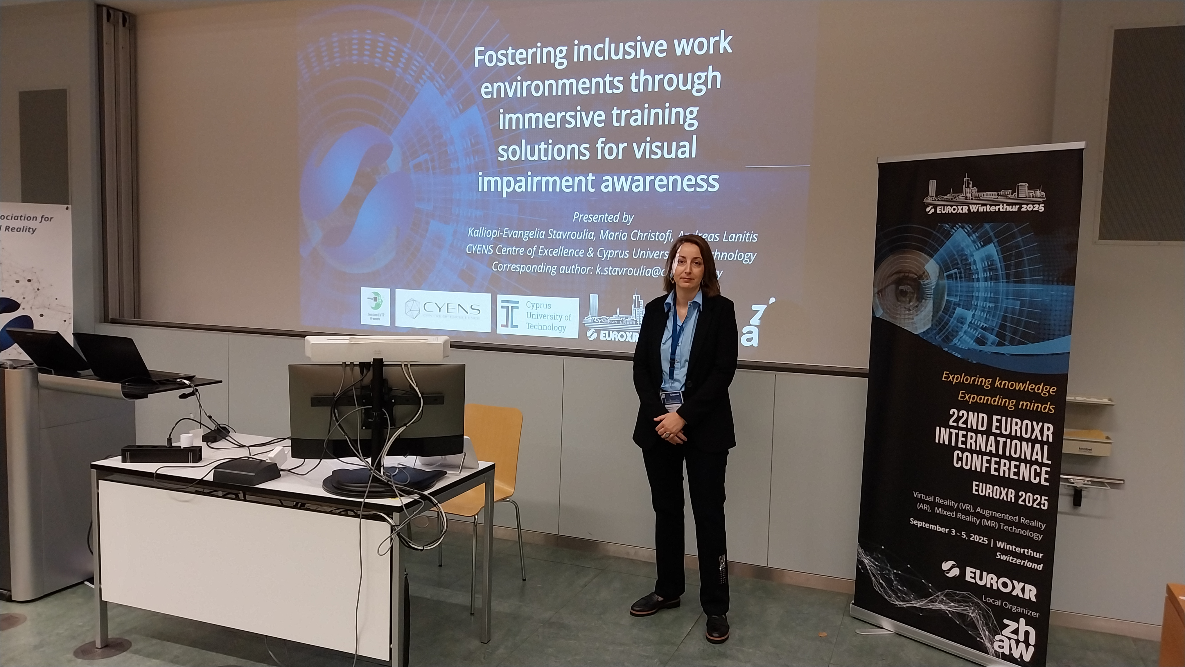 InclusiVR@work team and CYENS are pleased to announce that Dr Kalliopi-Evangelia Stavroulia successfully presented a research paper, titled “Fostering inclusive work environments through immersive training,” at the 22nd EuroXR International Conference – EuroXR 2025, held from September 3rd to 5th, 2025, at the Campus St.-Georgenplatz – ZHAW School of Management and Law, Winterthur, Switzerland. The presentation was part of the application track, and it attracted attention from researchers, academics, industry professionals, and policymakers. The paper has now been officially published in the conference proceedings, which are available on the EuroXR 2025 website.